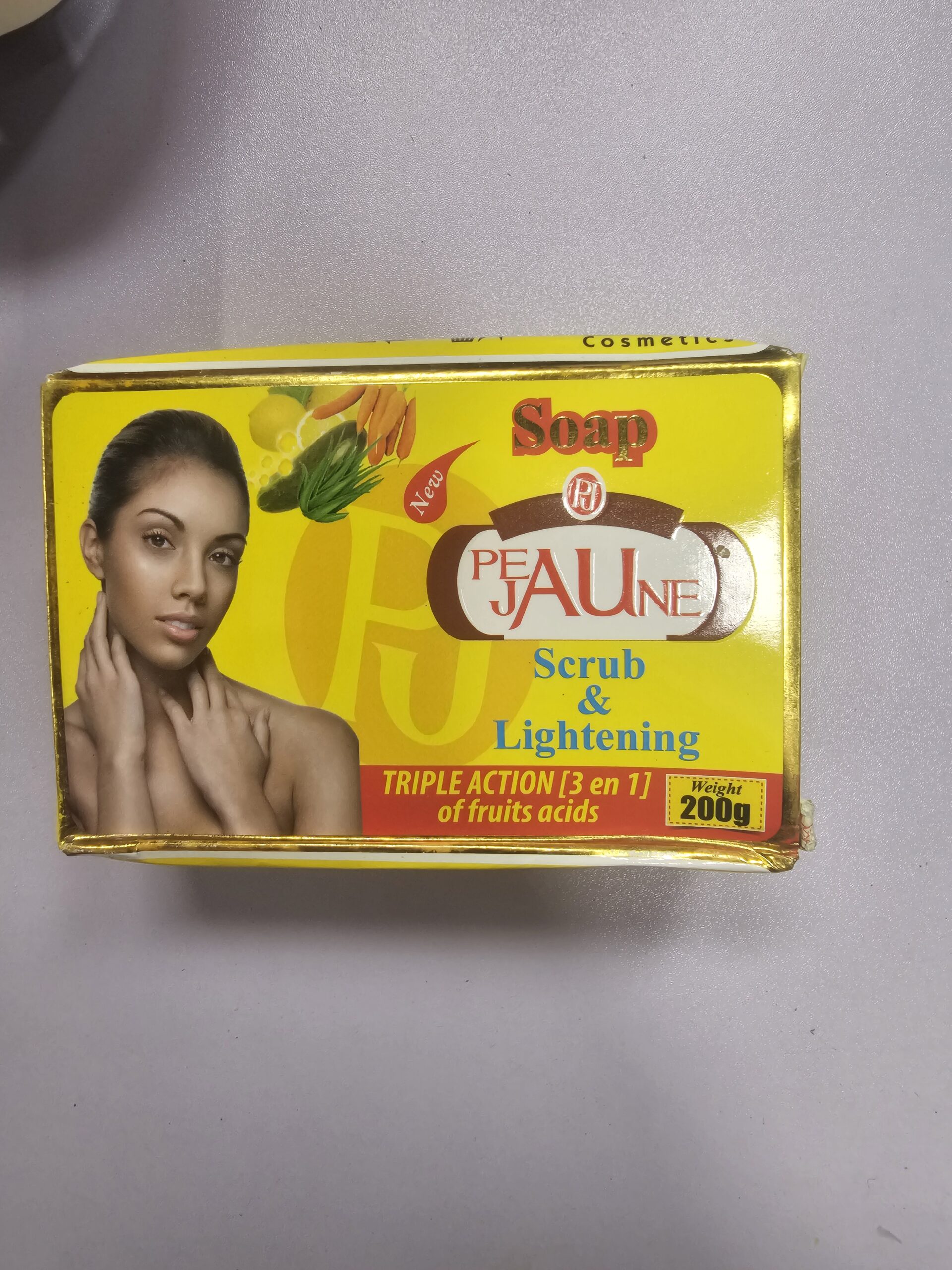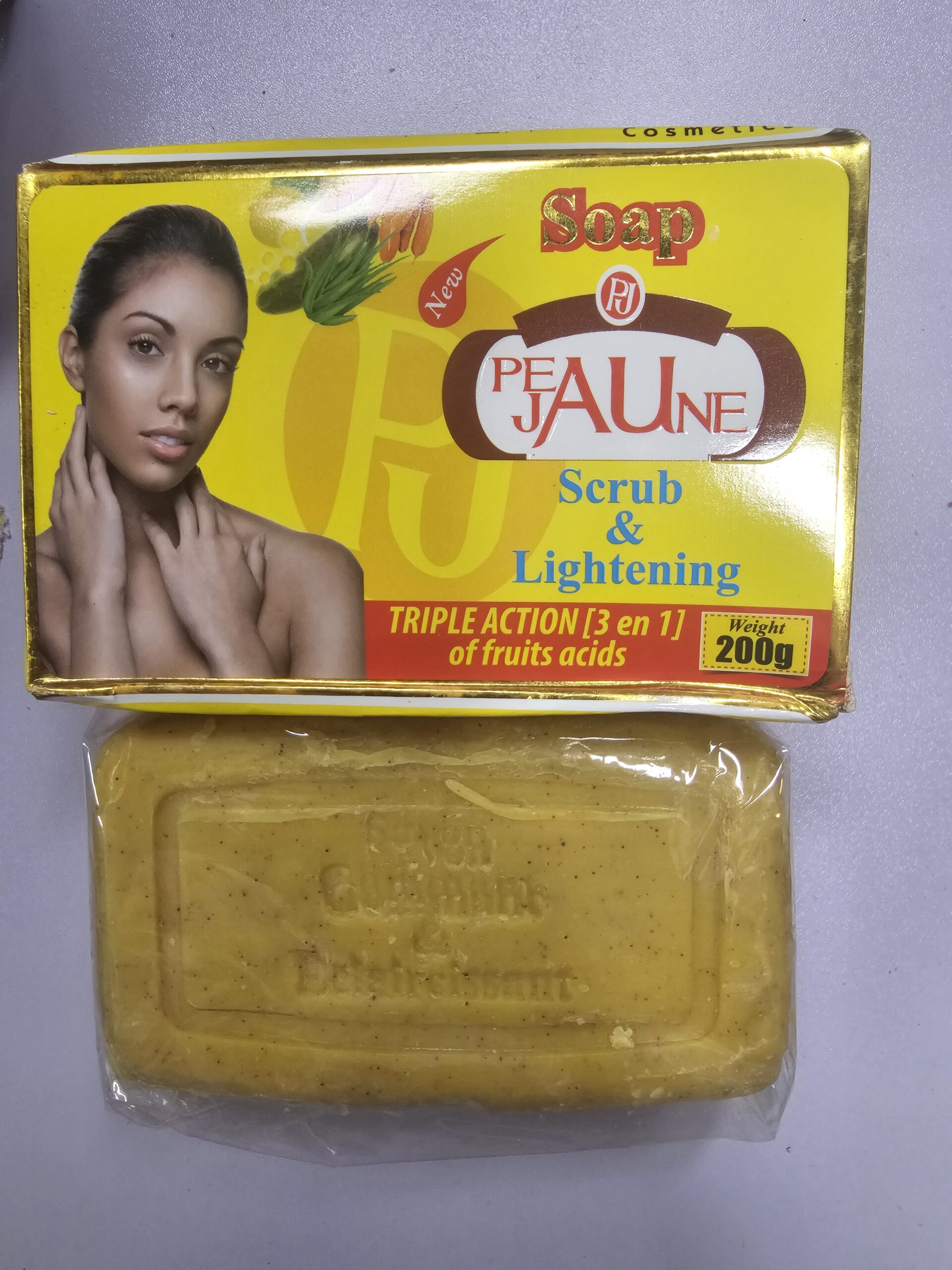 Pe jaune lightening scrub soap used to exfoliate and lighten skin. It is formulated to combat hyperpigmentation and is marketed for black and mixed-race skin tones.